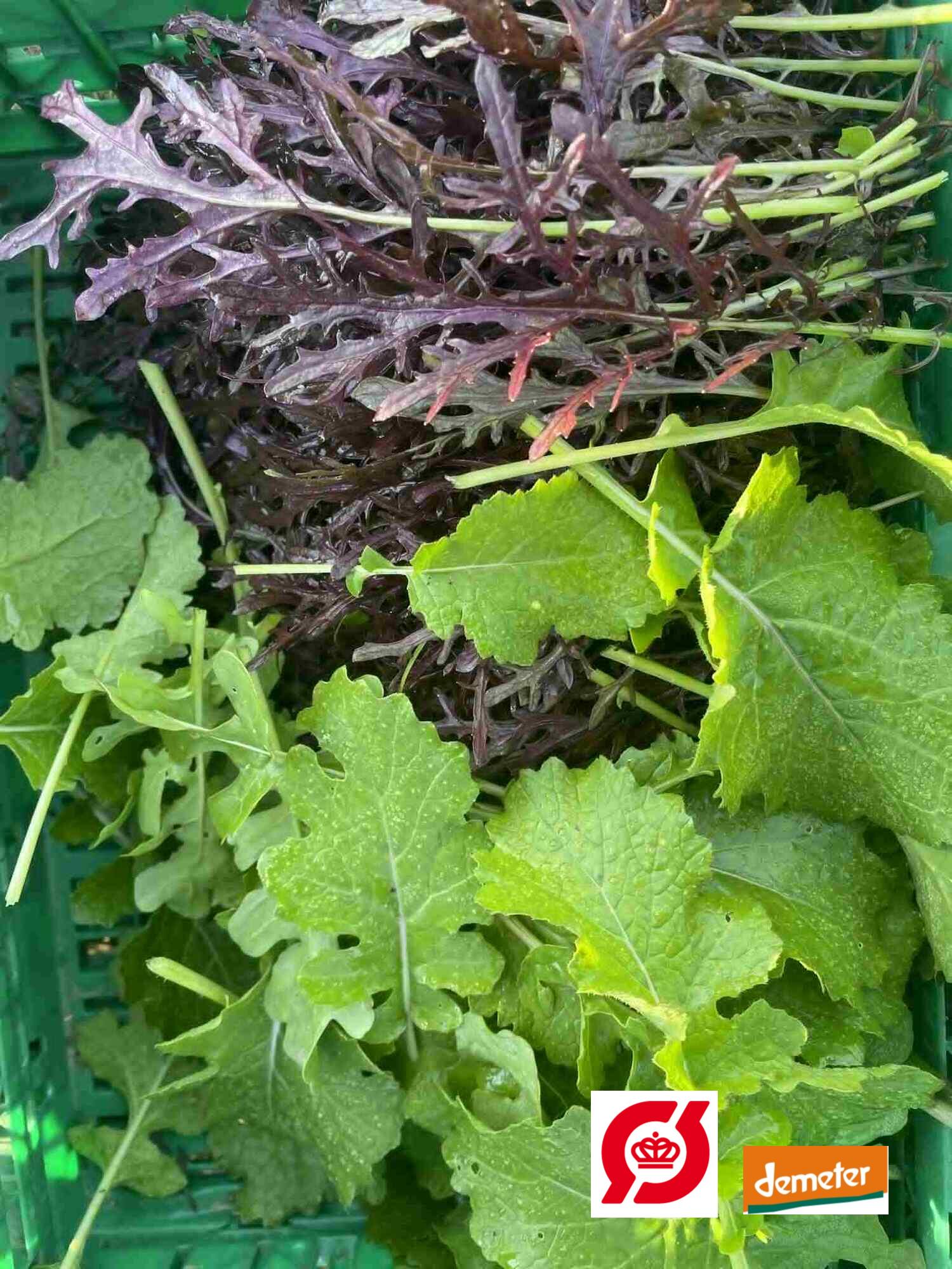 100 g røde og grønne asiatiske pluksalater fra marken. Økologisk/biodynamisk.