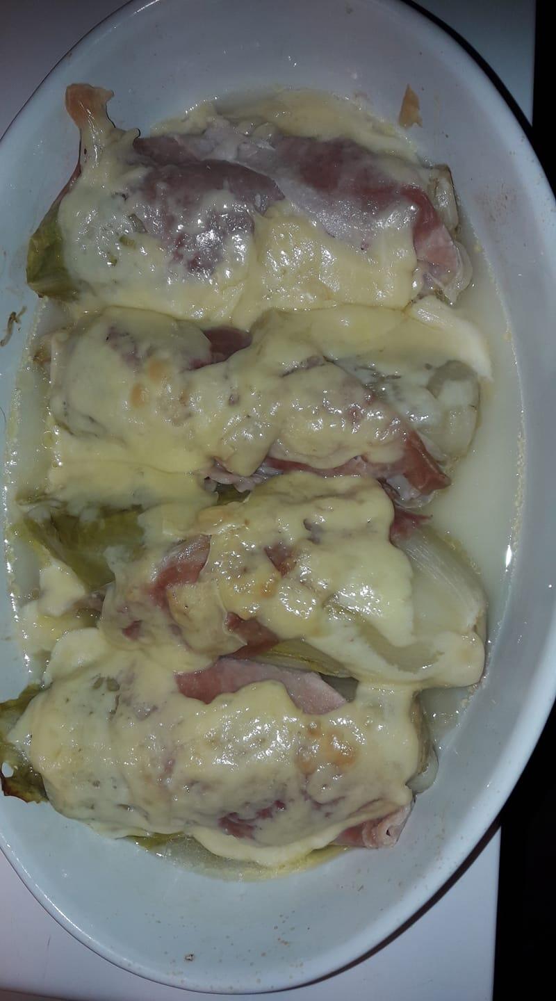Billedet viser vores ynglingsopskrift, hvor vi får salaten som varm aftensmad. Vi koger salaterne i i letsaltet vand i 10 minutter. Derefter vinkler vi skinke rundt om salaten og masser af ost ovenpå. Læg salaten i et ildfast fad og ind i ovnen ved 200 grader indtil osten er smeltet, ca. 20 minutter med vores gouda ost. Har du ikke skinke, så smager retten også rigtig godt alene med ost.